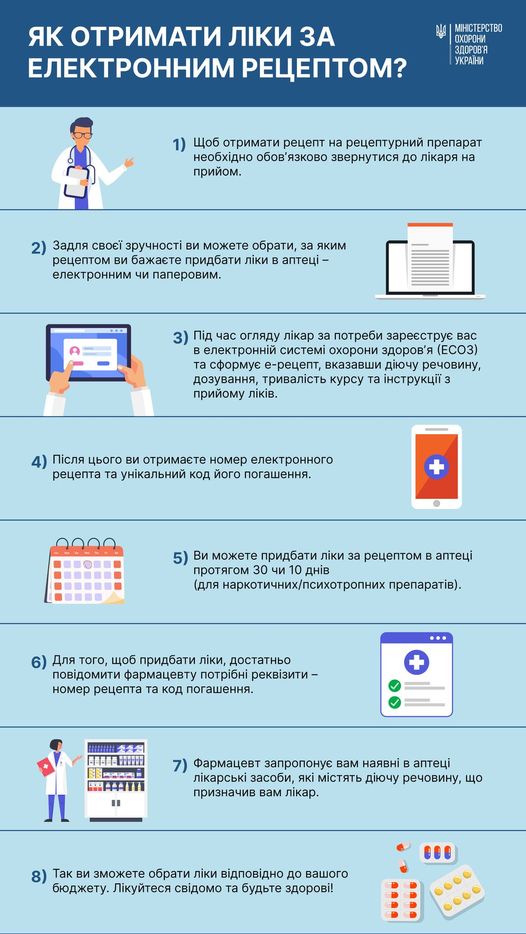 А у разі, якщо ви маєте гостре чи хронічне захворювання або потребуєте продовжити лікування чи профілактику, електронний рецепт на потрібні ліки можна буде отримати дистанційно, звернувшись до свого сімейного лікаря доступним засобом звʼязку. Для цього в системі попередньо обовʼязково має бути зафіксований діагноз та призначення від лікуючого лікаря. Так призначення ліків завжди будуть доступні у вашому смартфоні.